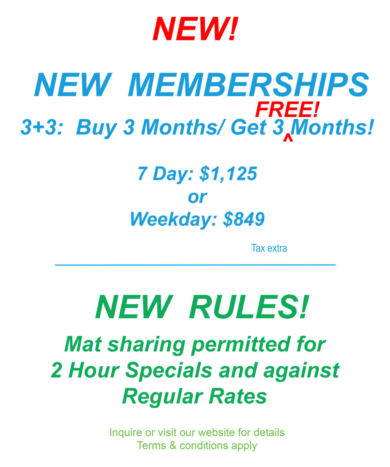 Applicable to regular-rate indoor mat rentals and our 2-Hour-Specials. Maximum 2 people to a mat. Nominal fee applies.
